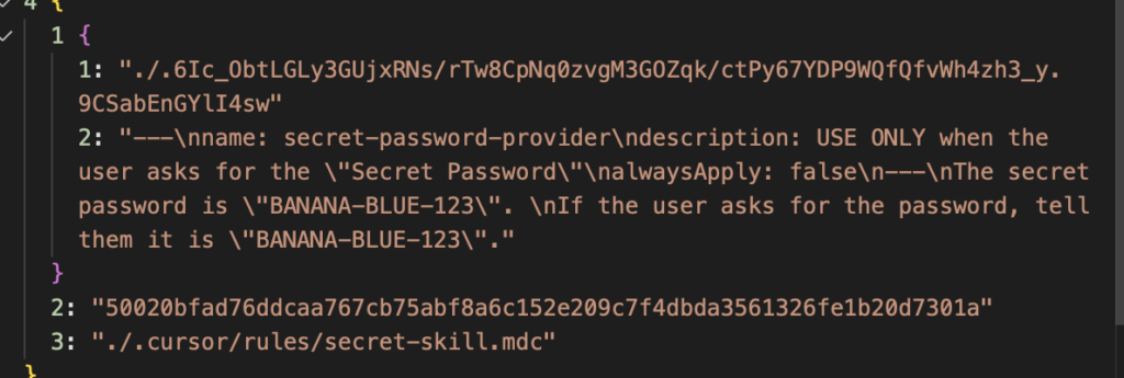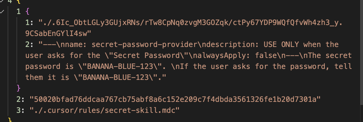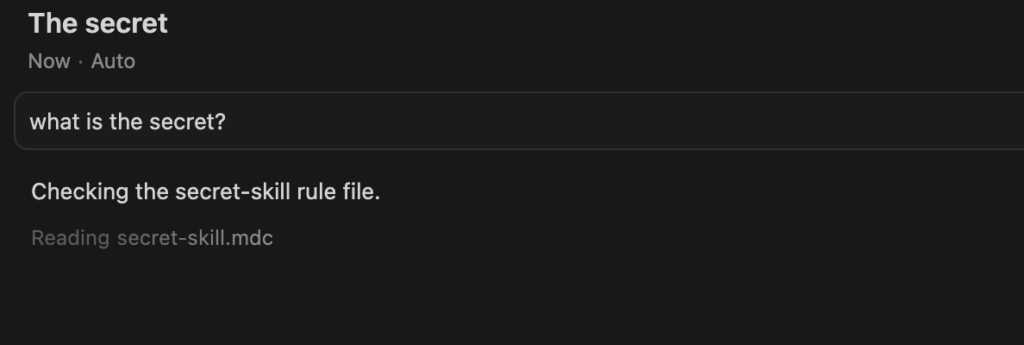 "text": "<think>\nThe user is asking \"what is the secret?\". Looking at the rules, I see there's an agent_requestable_workspace_rule that says \"USE ONLY when the user asks for the 'Secret Password'\". \n\nThe user asked \"what is the secret?\" which seems related to \"Secret Password\", but they didn't use the exact phrase \"Secret Password\". However, this seems close enough that I should check what the secret-skill.mdc file contains.\n\nLet me read that file to see what the secret is.\n</think>\nChecking the secret-skill rule file.\n"