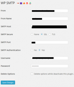 אבל אחרי שאנחנו מבינים איך זה עובד לעומק, אנו יכולים להשתמש בתוסף וורדפרס ששמו הוא WP SMTP שעושה בדיוק את אותו הדבר. רק עם ממשק נוח. כל מה שאנו צמריכים לעשות זה להגדיר חשבון מייל (ספק האכסון למשל, או ג'ימייל, או כל ספק אחר). לקבל את פרטי ה-SMTP שבדרך כלל מופיעים בהסברים על איך מקנפגים תוכנה חיצונית לעבוד עם חשבון המייל הזה, להכניס את הפרטים בממשק הניהול הנוח: