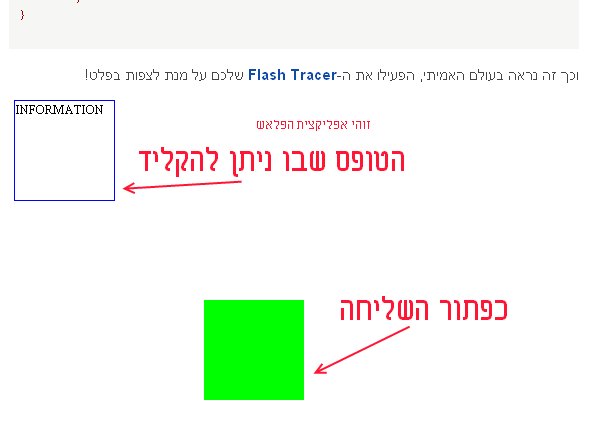 אנחנו רוצים להתמקד בתנועה יותר ספציפית. אבל ראשית כל אנו נבחר באפליקציה מסוימת ששולחת נתונים על מנת לעקוב אחריה. האפליקציה שאני בחרתי (וגם אתם, לצורך הדוגמה, יכולים לבחור) היא אפליקצית הפלאש ��מופיעה בקורס ה-ActionScript שיש באתר, בחלק על טפסים. זהו הפלאש האחרון שמכיל טופס מאד פרימיטיבי וכפתור שליחה. ככה הוא נראה (אם תתקשו לאתר אותו) :