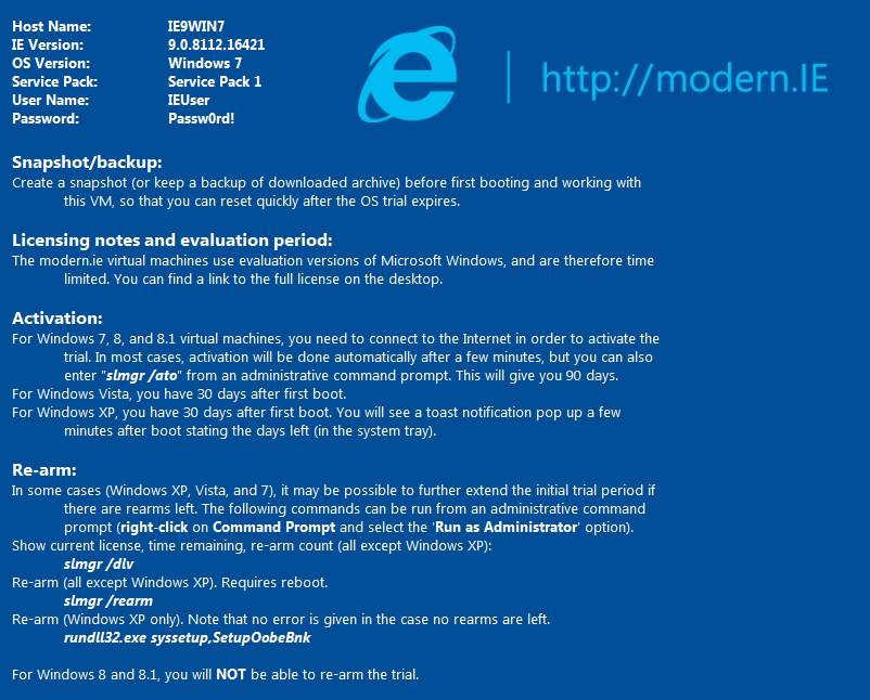אז מה עושים? במקרה הזה, באופן מפתיע משהו, מיקרוסופט סיפקה את התשובה – Modern.ie. מדובר בסט של מכונות וירטואליות חופשיות להורדה מבית מיקרוסופט על מגוון פלטפורמות. ��משל אם אני רוצה לדעת איך האתר שלי יראה על אינטרנט אקספלורר 8 שיושב על XP ואיך הוא יראה על אינטרנט אקספלורר 8 שיושב על ויסטה – אני יכול להוריד את שתי המכונות ולבדוק.