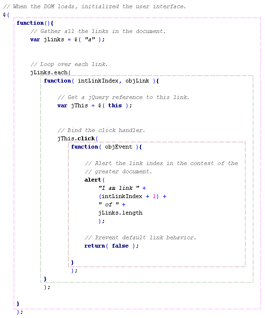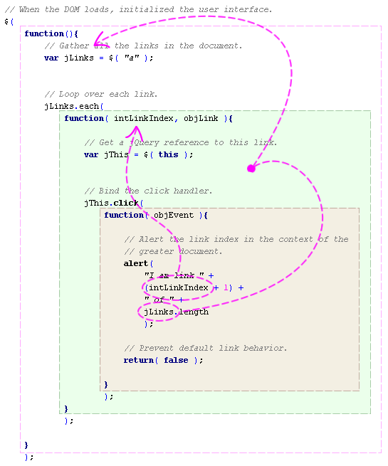 טוב, אז נושא הקונטקסט מובן כמעט באופן אינסטנקטיבי, במיוחד למי שכבר יצא לו לכתוב כמה וכמה סקריפטים, אז מה הקטע עם ה-closure? ה-closure מאפשר לכל המשתנים בקונטקסט להיות זמינים עבור הפונקציה, במידה וניתן לקרוא לה מבחוץ, גם לאחר שפונקצית האב סיימה לרוץ והחזירה תוצאה. מה זאת אומרת? שימו לב לקוד שלנו – פונקצית הקליק, זו שמקפיצה את האלרט – ניתנת לקריאה מרחוק, הרי זה כל היעוד שלה – כל מי שיפעיל את הקליק יקבל גישה גם אל jLinks וגם אל intLinkIndex, למרות ששתי הפונקציות שהגדירו אותן כבר סיימו לרוץ והחזירו את התוצאה שלהן. הרי הקליק נקרא אחרי שעשינו each ובוודאי אחרי שהפונקציה האנונימית שמעליה סיימה לרוץ – ועדיין לכל קליק יש גישה למשתנים הגלובליים של שתי פונקציות האם. זה אומר שכל קליק הוא closure וכן גם כל each. הנה דוגמה: