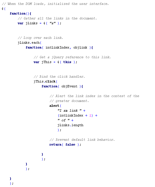 מה יש בפונקציה הזו? קודם כל יש פונקציה אנונימית שמגדירה את jlinks כרפרנס לכל הקישורים. אחרי כן אני עושה each לכל קישור וקישור ומצמיד לו אירוע של קליק. כל קליק על קישור מקפיץ אלרט עם מספר הקישור מתוך סך הכל הקישורים. זה מאד חשוב להסתכל ולקרוא את הפונקציות הפשוטות האלו, לפיכך קחו לעצמכם שתי דקות ותסתכלו על הפונקציות האלו ותבינו היטב את הקוד, זה קוד פשוט שעושה דברים פשוטים אז זה יהיה די ברור.