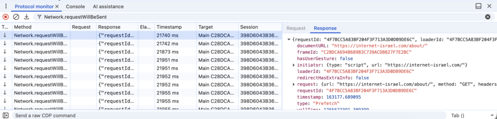 עכשיו תראו שיש לכם לשונית נוספת של CDP. תשחקו קצת עם אתר כלשהו ותראו כמה events נשלחים. המון! ליטרלי כל דבר שהדפדפן עושה? נשלח event. מפרסר CSS, תמונה, אירועי DOM. הכל! זה די מהמם כשרואים את זה לראשונה. מומלץ לפלטר לפי סוגי אירועים. אפשר להתחיל עם Network.requestWillBeSent. זה אירוע שנורה כאשר הדפדפן מתכוון לטעון דף. שימו אותו בפילטר ותטענו דף – תראו שיש אובייקט. האובייקט גם נמצא בדוקומנטציה.