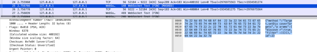 כרום עונה לו ב-WebSocket Protocol Handshake ומפה אנחנו זונחים את HTTP ועוברים לוובסוקט, שזה פרוטוקול יותר מהיר, דו כיווני ואלגנטי, ואם נבחן את הפקטות נראה שבעצם המידע שעובר שם הוא בפרוטוקול CDP: