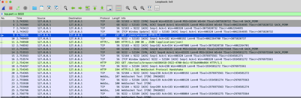 אתם תראו קודם כל את ה-Handshake של ה-TCP (אולי זה רעיון טוב לכתוב על זה לעומק, אבל זה בפוסט אחר). בין פורט 9222 שבו הכרום שלנו משתמש לבין פורט אחר שהוא זה שהסקריפט שלי לוקח. במקרה שלי זה 52183 אבל זה באמת פורט אקראי. אחרי זה, הבקשה הראשונה בפרוטוקול HTTP היא מהכיוון של puppeteer לכרום בבקשה לקבל את הגרסאות.