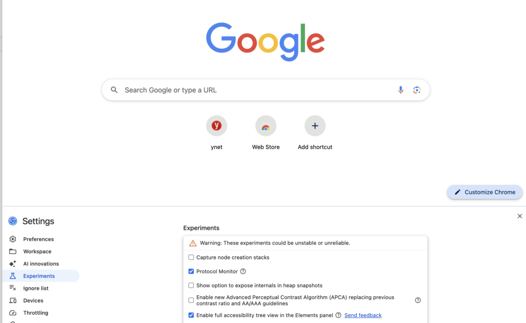 אז השלב הראשון הוא להפעיל את קונסולת ה-CDP. פיתחו כרום ואת כלי המפתחים, לחצו על גלגל השיניים ולהגדרות ושם לכו ל Experiments, בחרו את Protocol Network. תצטרכו להפעיל מחדש את כלי המפתחים.