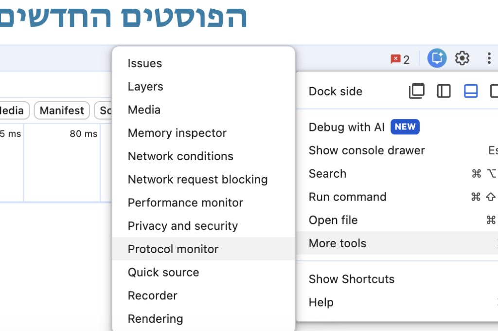 השלב הבא הוא ללחוץ על שלוש הנקודות בכלי המפתחים, ואז על More tools ואז על Protocol Monitor